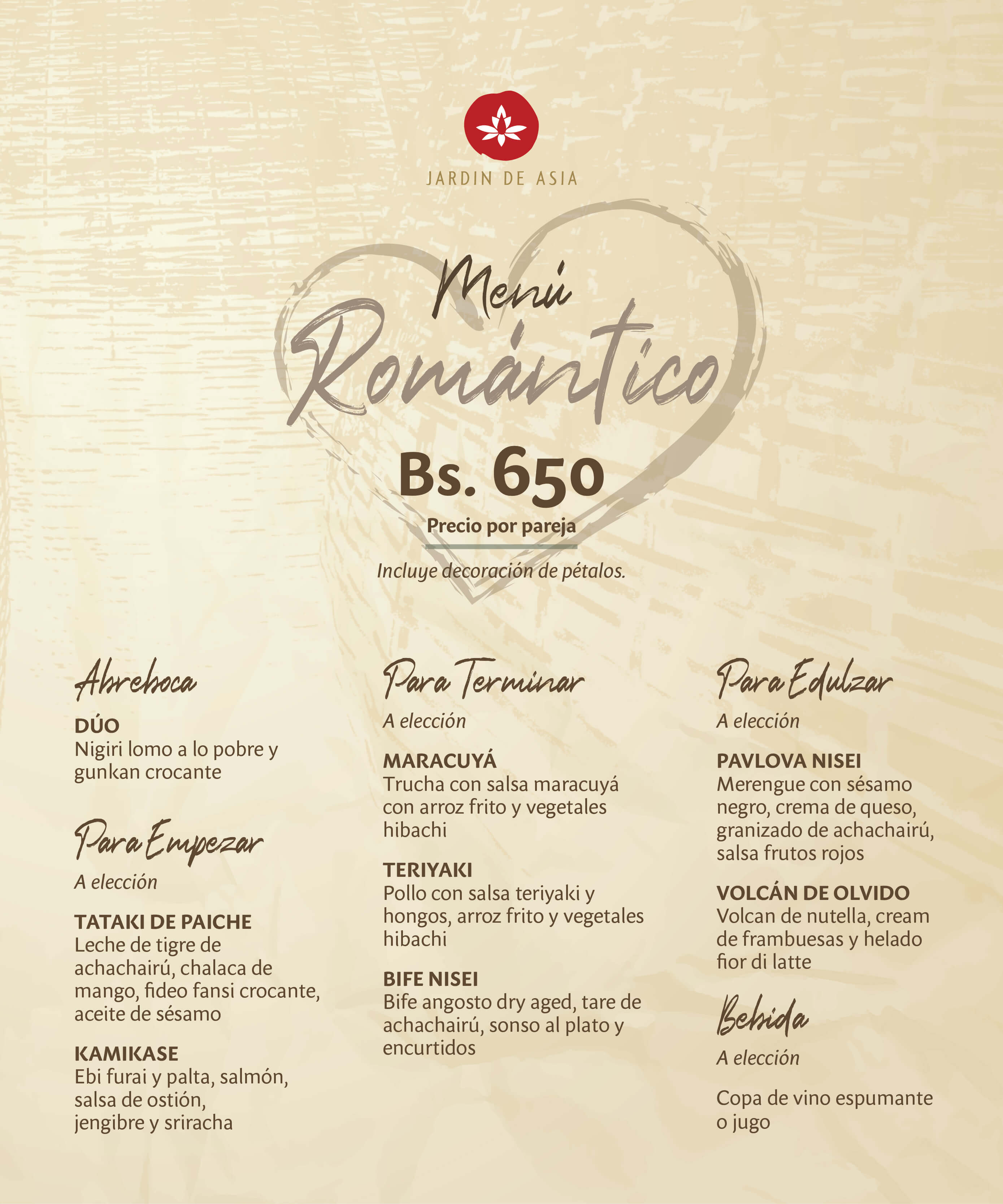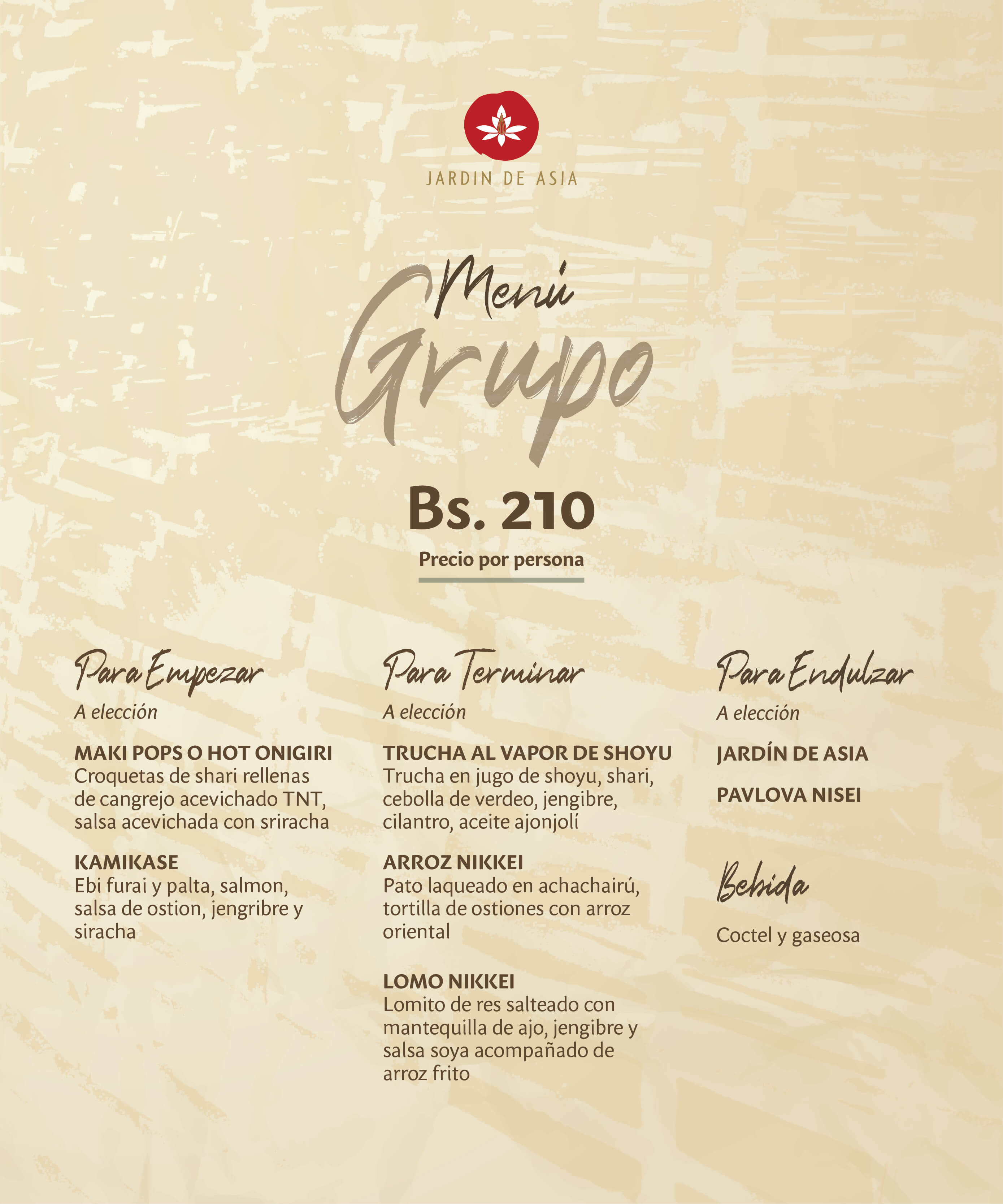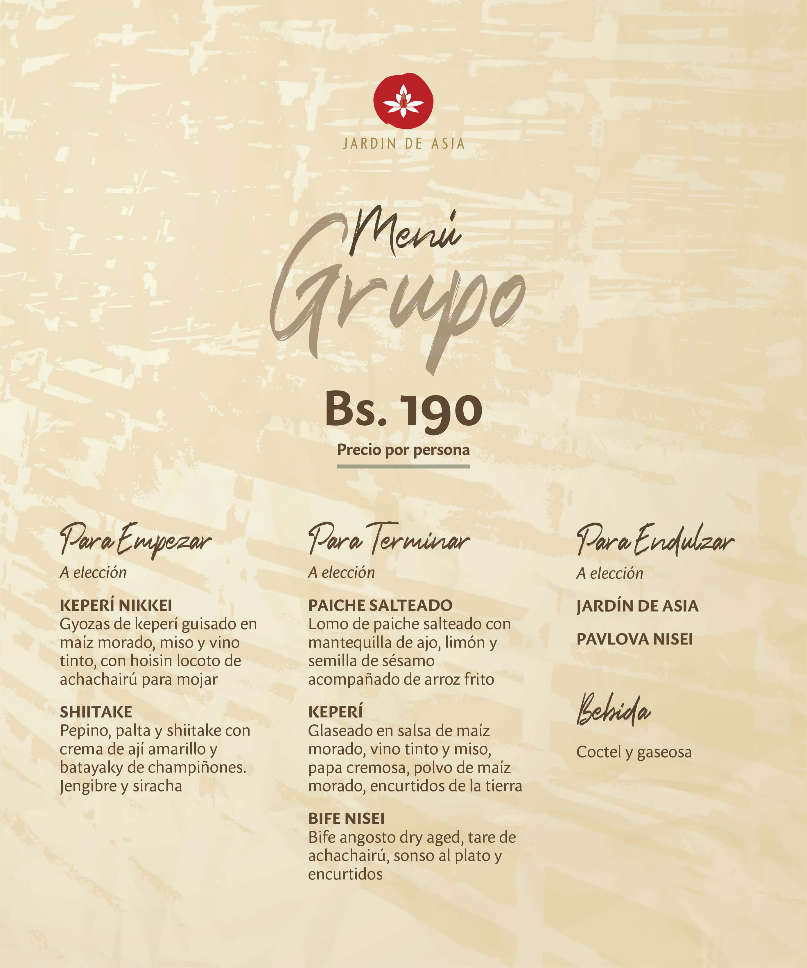 Deléitese con un viaje lleno de sabor en Santa Cruz. Jardín de Asia ofrece una cocina excepcional con productos bolivianos con influencia asiática. Ya sea si desea disfrutar una cena a la carta o un almuerzo podrá hacerlo en un ambiente refinado con una arquitectura inspirada en los cuatro elementos, con diferentes espacios para elegir entre el Ajakaí, las canastas icónicas del restaurante, el Teppanyaki o un lounge al aire libre. Todo bajo un techo estrellado que replica las constelaciones del hemisferio norte. Debido a un nuevo y audaz enfoque culinario con ingredientes de origen local, Jardín de Asia de la mano del chef ejecutivo, Diego Alcántara, cuenta con un nuevo menú que se distingue de los demás restaurantes de la ciudad, por estar en constante búsqueda de nuevos sabores para ofrecer la identidad gastronómica cruceña en cada bocado. Este año nuestro restaurante cumplirá 15 años